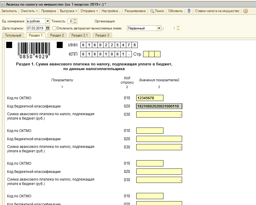В разделе 1 отчета Авансы по налогу на имущество присутствуют несколько одинаковых блоков для авансов, которые рассчитываются по разным ОКТМО и КБК. Данный раздел заполняется на заключительном этапе оформления расчета и представляет собой результат всех исчислений по разделу 2 и 3.