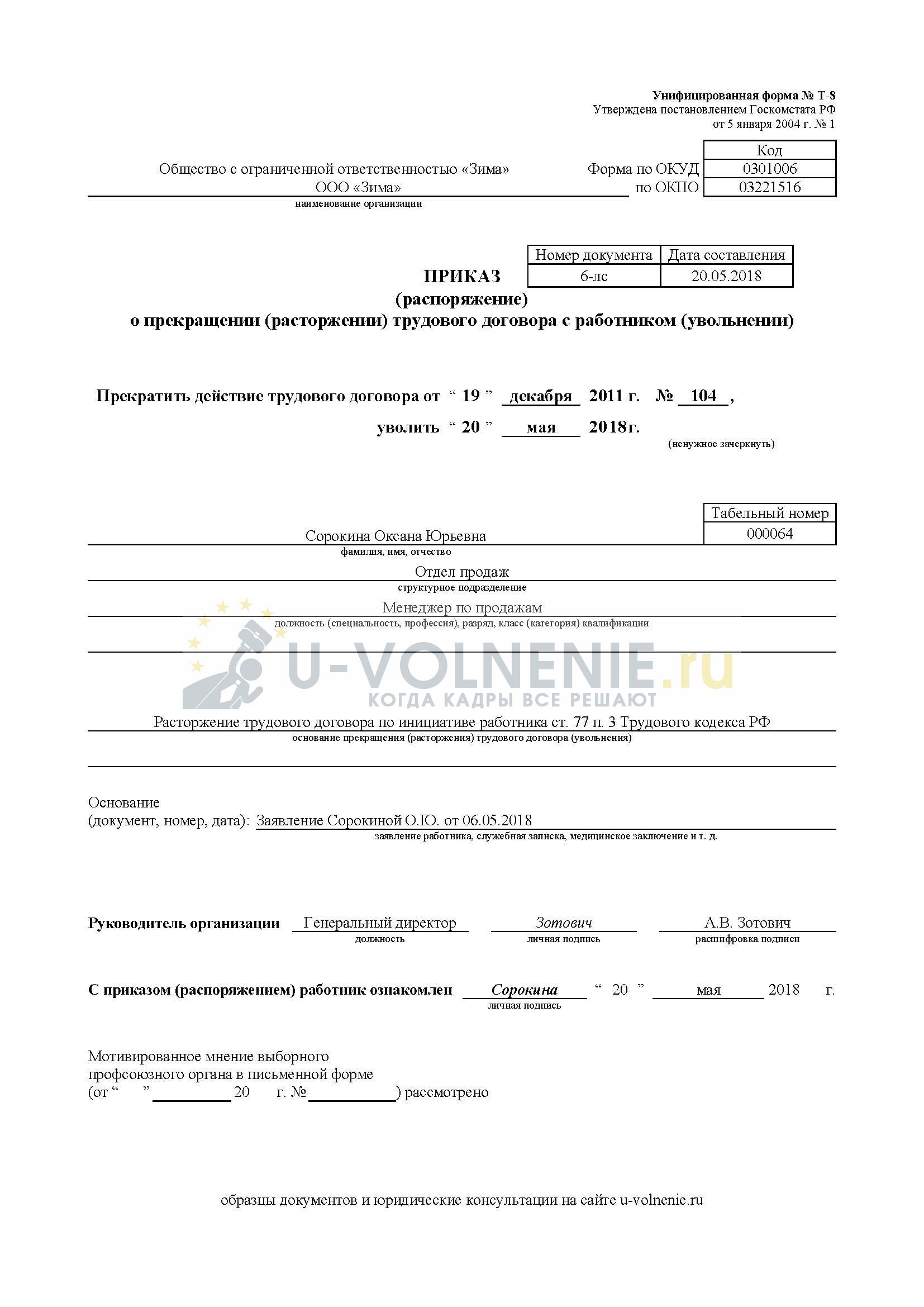 Когда заявление получено уполномоченным лицом – издается приказ, отражающий прекращение трудовых отношений с сотрудником. Работник в документе ставит свою подпись, которая подтверждает факт ознакомления с актом.