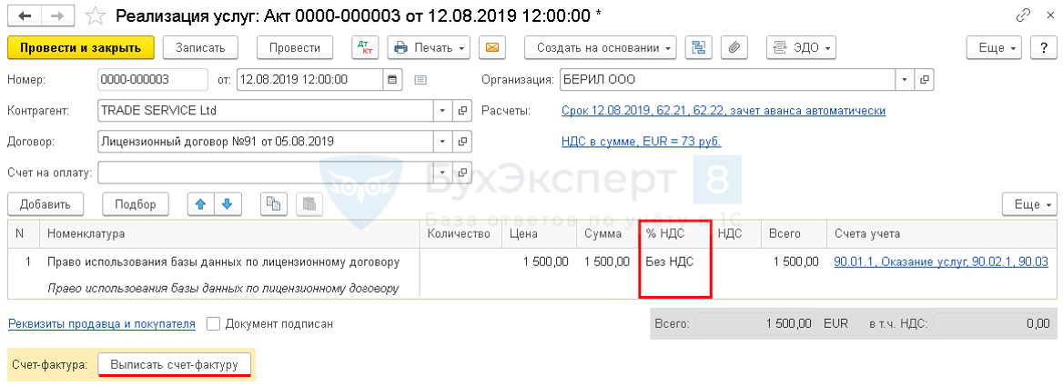 - Счет-фактура – Выписать счет-фактуру не требуется (пп. 1 п. 3 ст. 169 НК РФ);