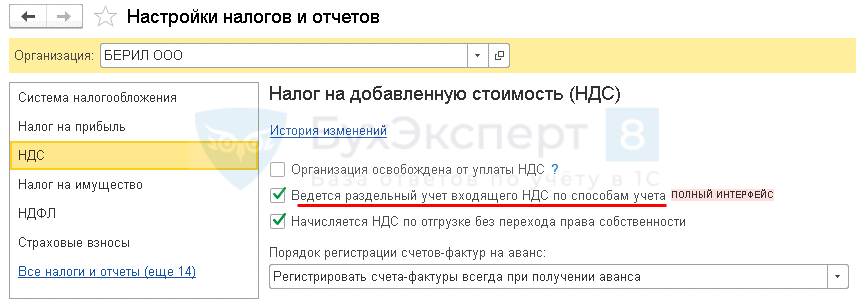 Администрирование – Настройки программы – Параметры учета ссылка Настройка плана счетов – Учет сумм НДС по приобретенным ценностям: ссылка По контрагентам, счетам-фактурам полученным, способам учета.