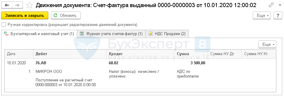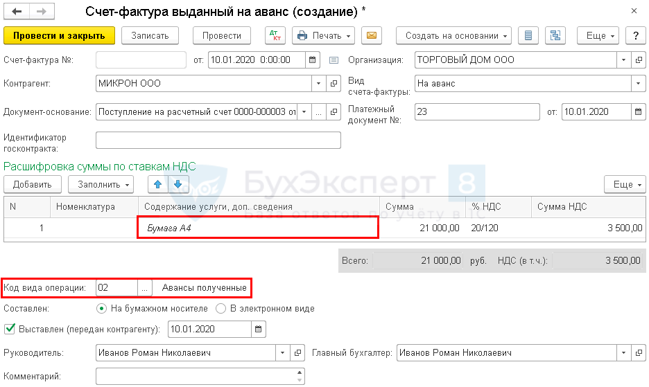 - Платежные документы — дата и номер платежного поручения покупателя на аванс (автоматически не заполняется, укажите вручную);