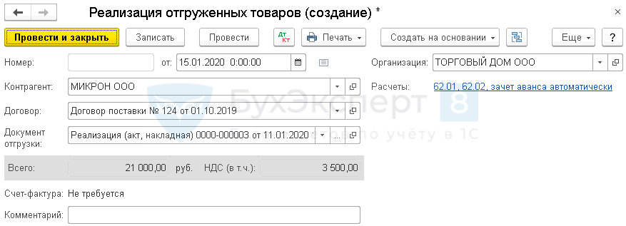 Данные счета-фактуры автоматически заполняются на основании документа Реализация (акт, накладная).