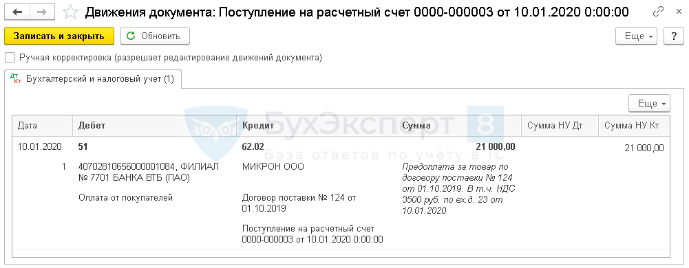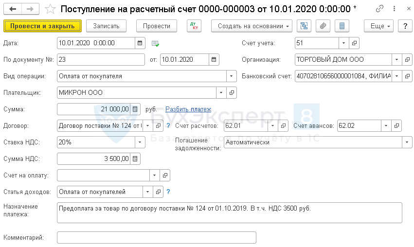 Данные будут заполнены автоматически по документу Поступление на расчетный счет.