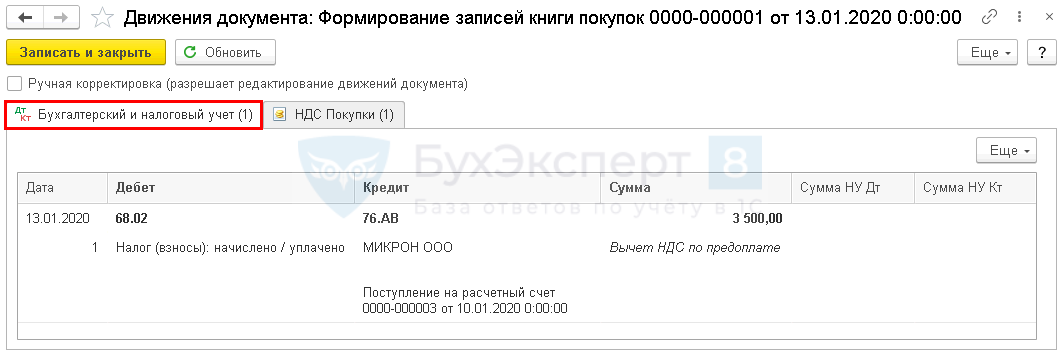 Вычет НДС, исчисленного с предоплаты, отразите в обычном порядке документом Формирование записей книги покупок (раздел Операции — Регламентные операции НДС — кнопка Создать — Формирование записей книги покупок).