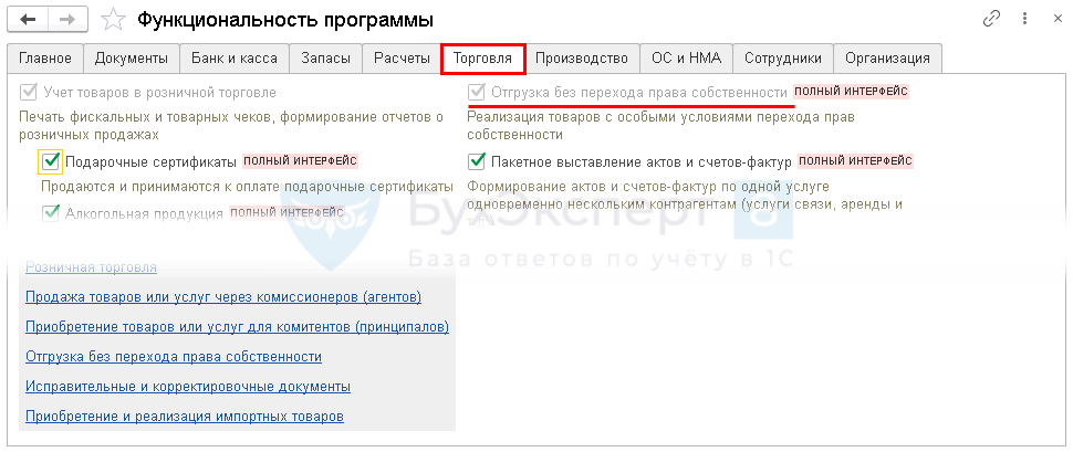 Чтобы включить возможность отражения отгрузки товаров без перехода права собственности, выставите флажок Отгрузка без перехода права собственности в разделе Главное — Функциональность — вкладка Торговля.