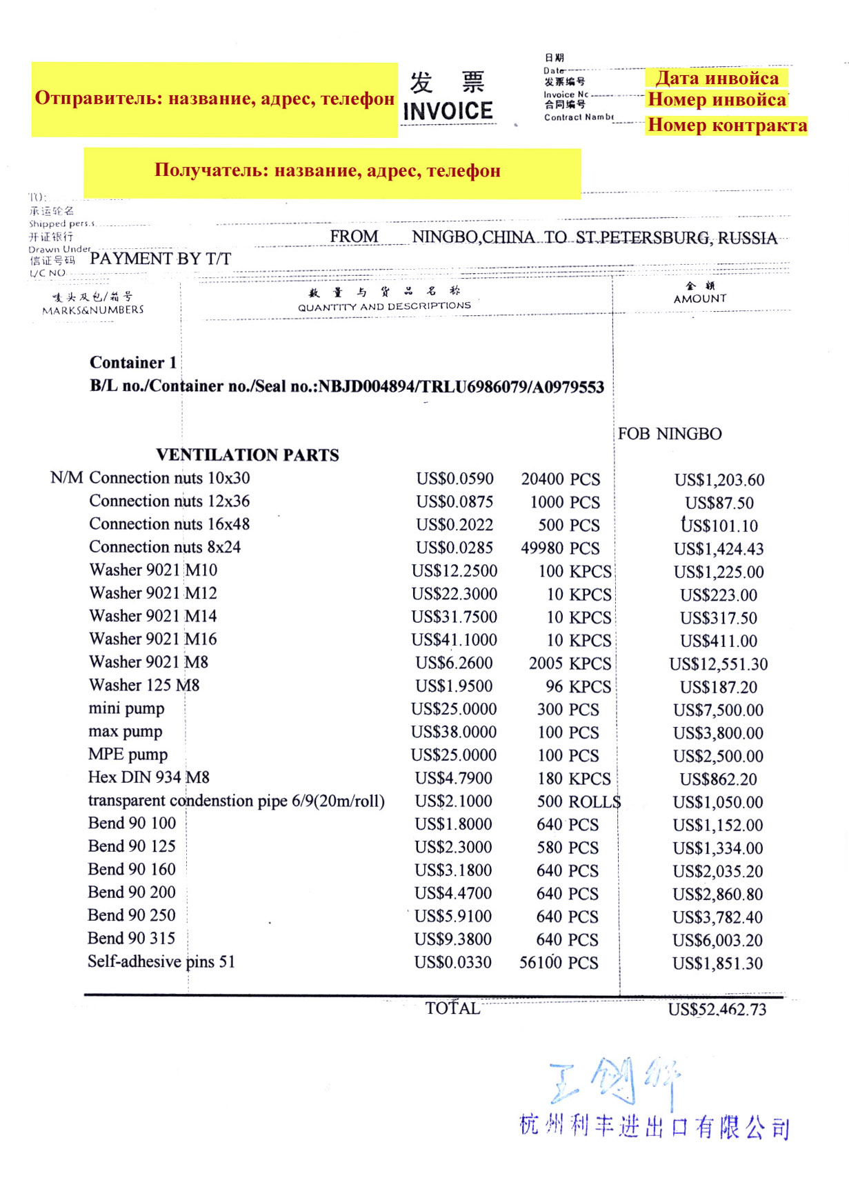 В коммерческий инвойс отправителем должны быть включены следующие данные: