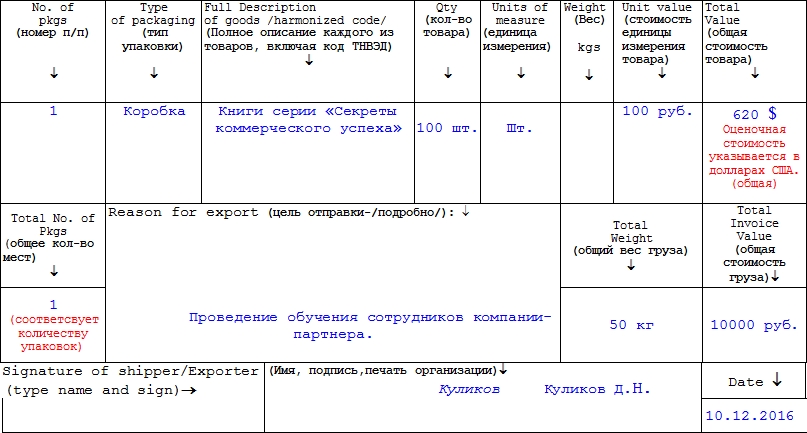 В общем случае отечественные компании стараются придерживаться тех образцов, которые уже были разработаны зарубежным партнером. В случае первой отправки можно запросить предварительно пример заполнения по электронной почте – особенно, если предполагается регулярная поставка на довольно большие суммы.