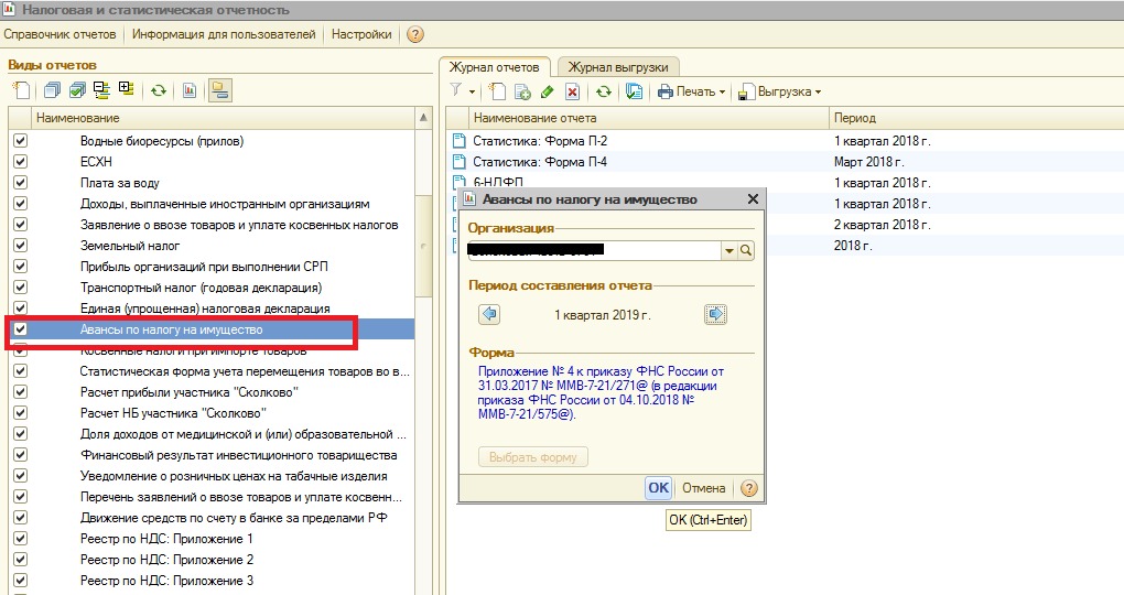 Для того чтобы заполнить и предоставить в налоговую инспекцию расчет в программе, следует открыть форму «Налоговая и статистическая отчетность» (меню «Бухгалтерский учет» — «Регламентированные отчеты»), создать отчет «Авансы по налогу на имущество», выбрав отчетный период, за который отчитывается учреждение.