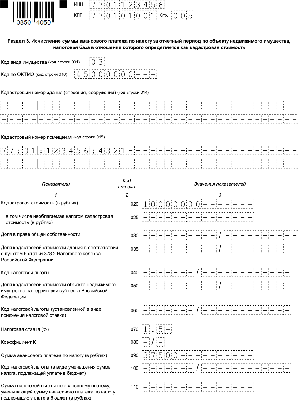 - раздел 3, в котором отражено исчисление суммы авансового платежа по налогу за отчетный период по объекту недвижимого имущества, налоговой базой в отношении которого признается кадастровая стоимость.
