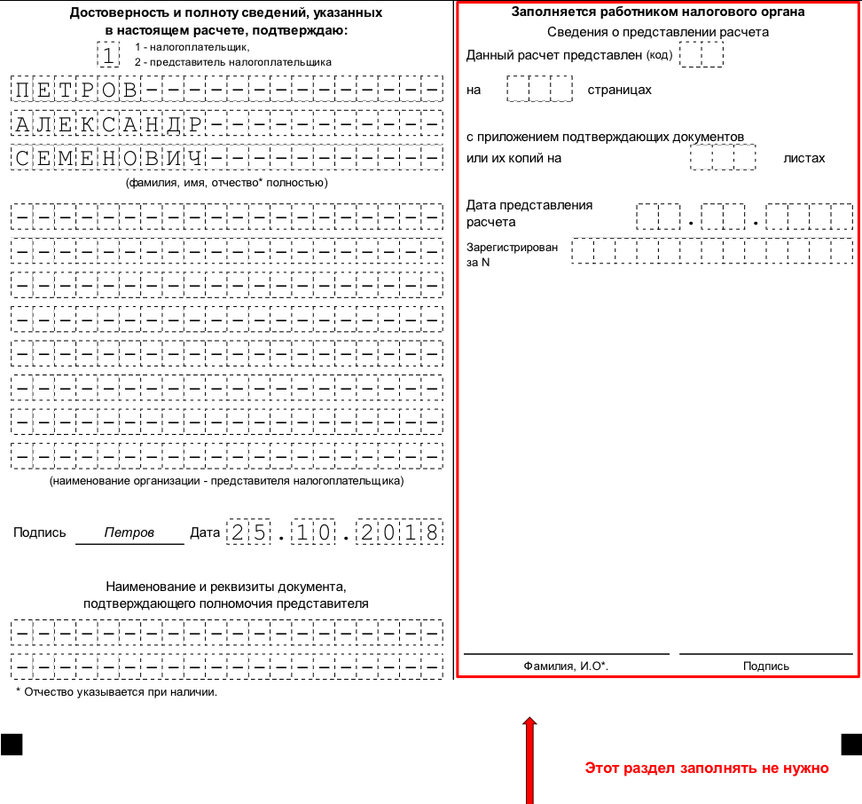 - В поле «Достоверность и полноту сведений подтверждаю» заносится информация об ответственном лице, подписавшем расчет, его подпись и дата заполнения. Если форму сдает представитель, то в этом же поле указываются реквизиты доверенности.