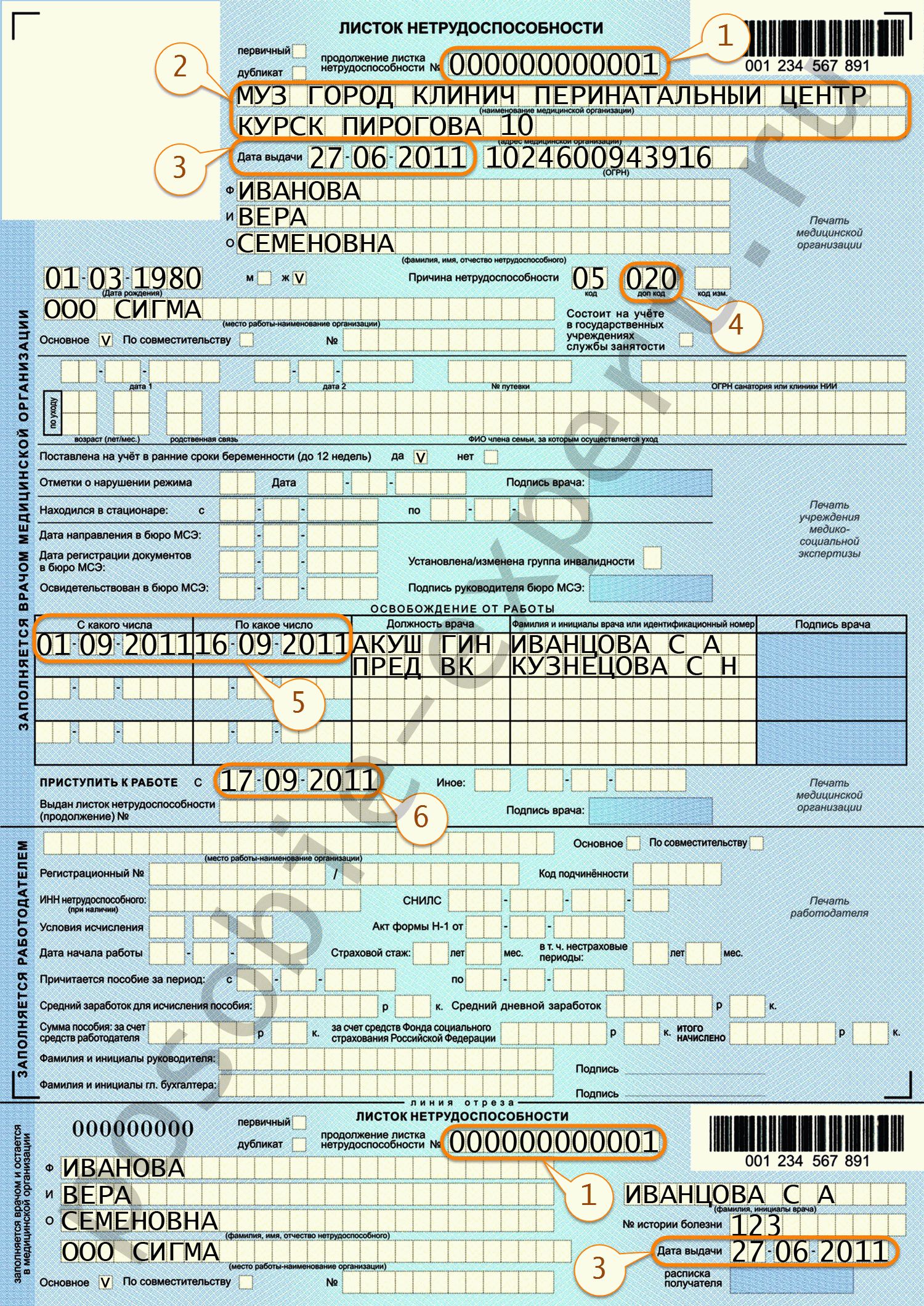 1 — номер предыдущего листка, устанавливающего стандартный срок декретного отпуска 140 дней; 2 — наименование и адрес учреждения родовспоможения, в который была определена женщина для рождения ребенка; 3 — дата выдачи продолжения листка нетрудоспособности, соответствующая составлению медицинского заключения об осложненном характере протекания родов и необходимости увеличения периода восстановления; 4 — дополнительный трехзначный код «020» для продления декрета (уточнение причины нетрудоспособности, связанное с осложнениями родовой деятельности); 5 — продленный срок освобождения от работы длительностью 16 дней, связанный с необходимостью предоставления по медицинским основаниям дополнительного отпуска по беременности и родам;