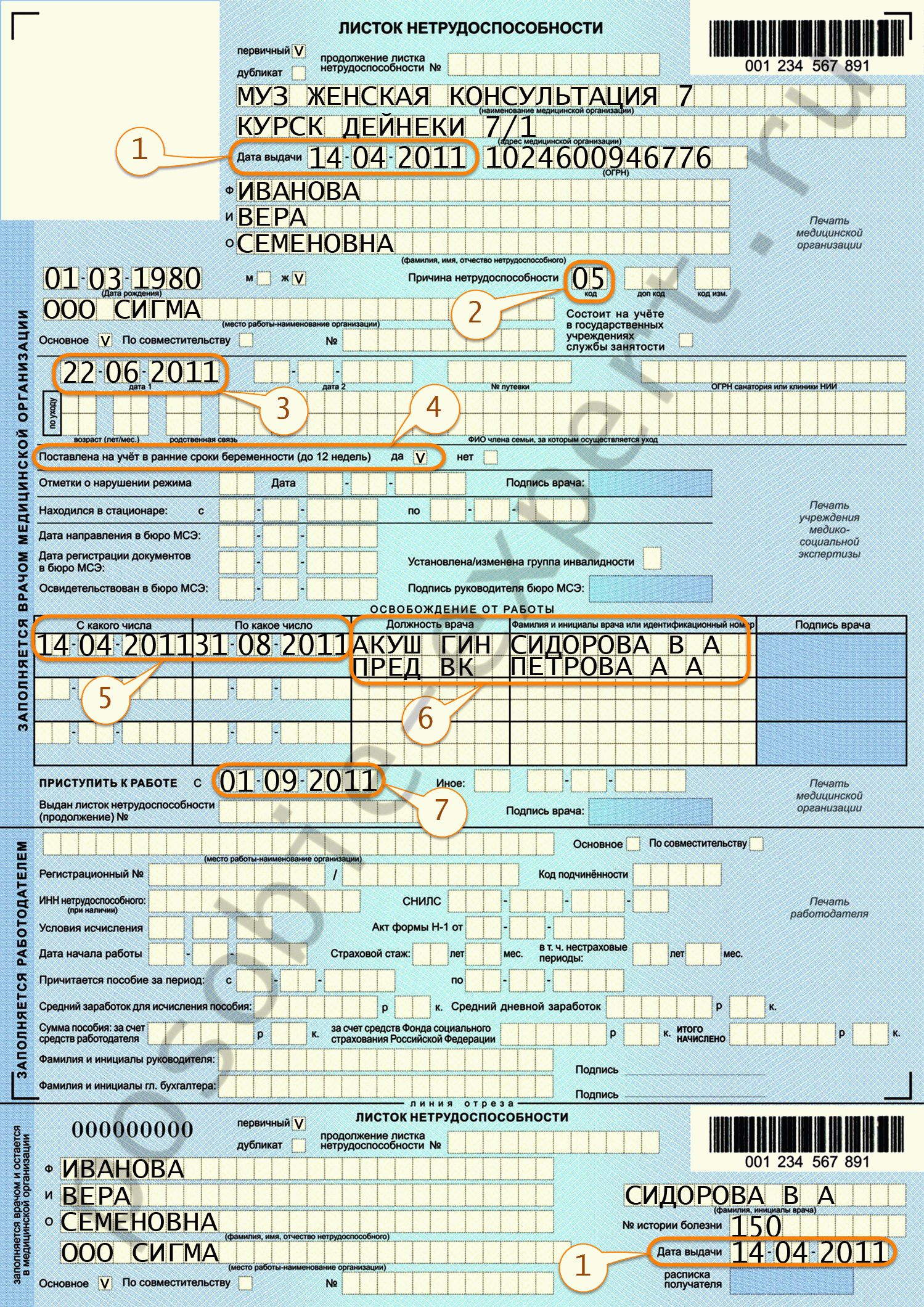 1 — дата выдачи больничного, соответствующая дню установления нетрудоспособности (наступление акушерского срока 30 недель); 2 — код причины нетрудоспособности («05» — отпуск по беременности и родам); 3 — предполагаемая дата родов, проставляемая врачом в графе «дата 1» (+ 70 дней при выдаче больничного листа в срок 30 недель); 4 — отметка о постановке на учет в ранние сроки беременности (до 12 недель) при наличии соответствующего факта; 5 — период нетрудоспособности (140 дней, отсчитывая от дня выдачи листка нетрудоспособности); 6 — должность и фамилия врача и (не обязательно) председателя врачебной комиссии, установивших период больничного по беременности и родам;