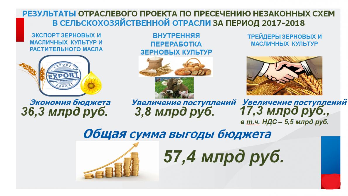 — предотвращены потери бюджета при экспорте зерна в размере 27,94 млрд руб. и растительного масла в размере 8,33 млрд руб.;