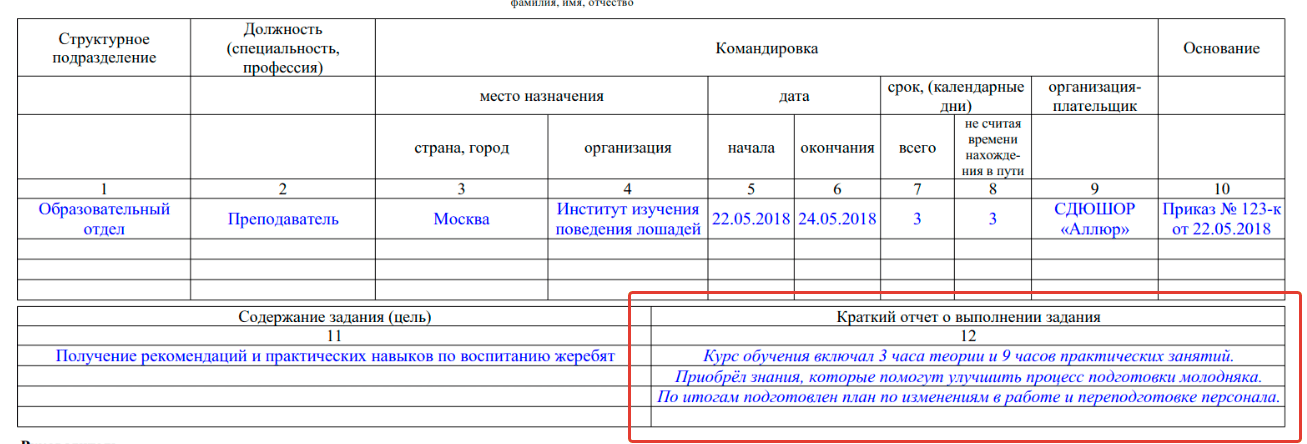 В первую очередь укажите, когда проходила служебная поездка — конкретные даты. Затем впишите цель, с которой работник был командирован в другую местность. Например, «прохождение курсов повышения квалификации» или «участие в тренинге».