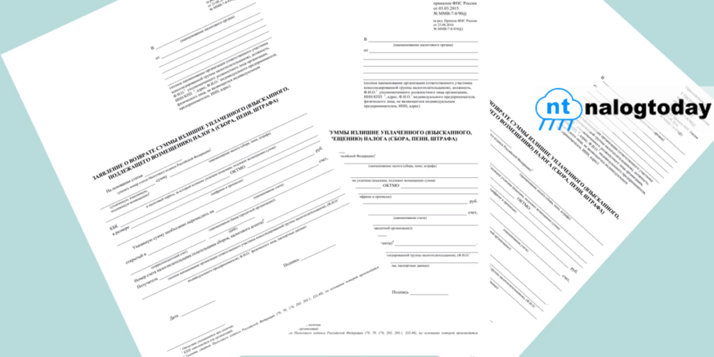 Актуальный бланк заявления о возврате суммы излишне уплаченного (взысканного, подлежащего возмещению) налога (сбора, страховых взносов, пеней, штрафа) можно скачать здесь.