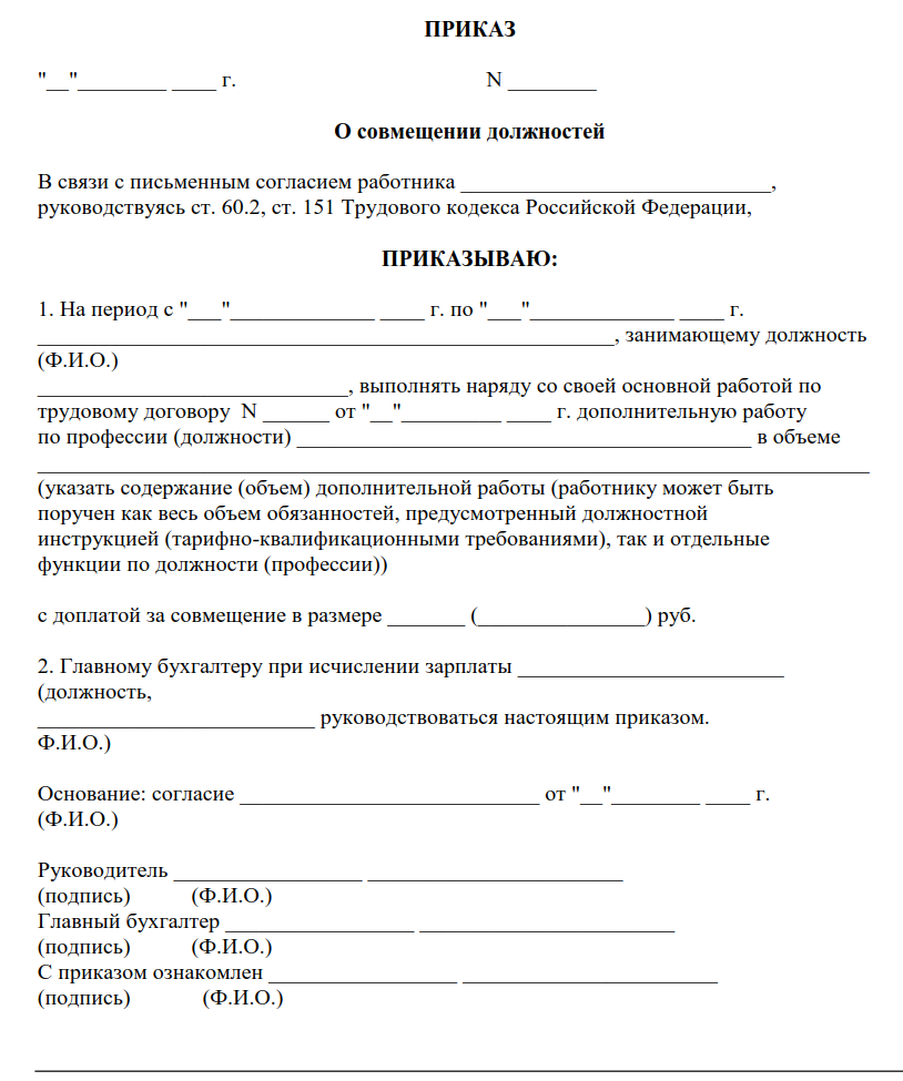 Важно понимать, что при совмещении недопустимо увеличение длительности рабочей смены или отрыв от исполнения основных обязательств. Для официального назначения в должность используются распорядительные документы