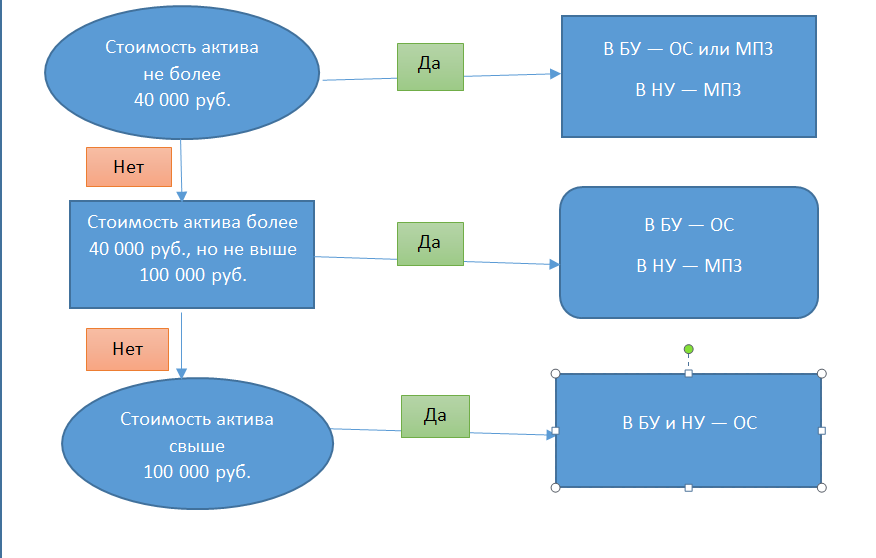 Итак, до 2016 года в обоих видах учета порог стоимости принятия ОС был един: все, что стоило 40 000 руб. и меньше, учитывалось в составе малоценного имущества. Теперь порядок немного другой. Наглядно это видно на схеме: