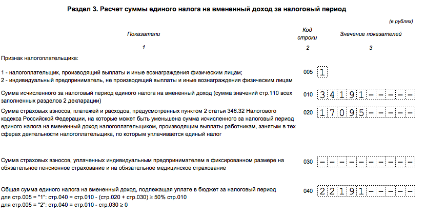 В составе декларации по ЕНВД за 3 квартал 2017 года в этом разделе рассчитывают общую сумму налога к уплате по всем местам и видам деятельности на ЕНВД (стр. 040). То есть этот раздел формируют на основе данных всех Разделов 2. При этом по строке 020 фиксируется сумма страховых взносов. См. «Уменьшение ЕНВД на страховые взносы в 2017 году».