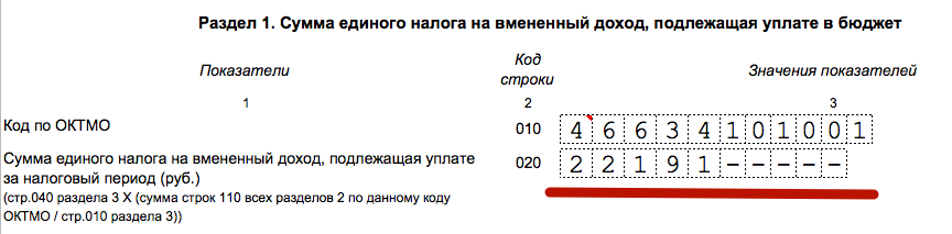 - по строке 020 – сумму ЕНВД к уплате по каждому муниципальному образованию (каждому ОКТМО). Просто перенесите сюда показатель из стр. 040 Раздела 3.