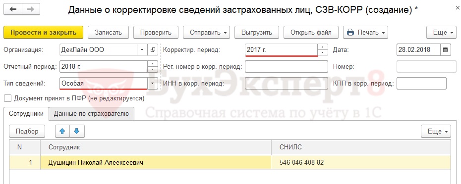 В этом необходимо сформировать форму СЗВ-КОРР с типом сведений Особая, указав в качестве отчетного периода 2018 г., а корректируемого – 2017 г. В табличную часть формы следует подобрать только работника Душицина Н.А.: