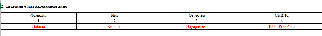 В разделе 2 следует зафиксируйте фамилию, имя, отчество в именительном падеже и СНИЛС застрахованного лица. Эти сведения должны соответствовать данным страхового свидетельства (п. п. 2.3.1, 4.3 Приложения 5).