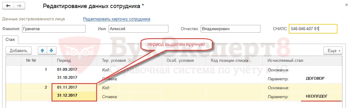 В сведениях по стажу автоматически весь период работы сотрудника будет обозначен кодом ДОГОВОР. Необходимо внести ручные корректировки, выделив отдельно период работы по второму договору с 1 ноября по 31 декабря 2017 г. под кодом НЕОПЛДОГ: