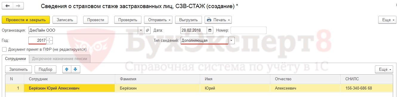 Создать СЗВ-СТАЖ с типом Дополняющая, где в поле Год указать «2017» и подобрать сотрудника Берёзкина в табличную часть: