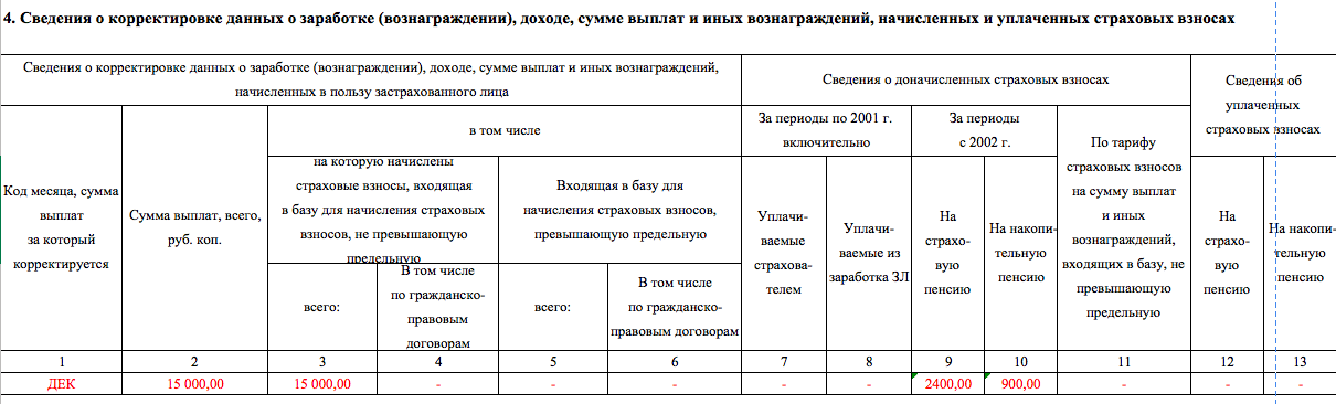 - данные о заработке (вознаграждении), доходе, сумме выплат и иных вознаграждений застрахованного лица (раздел 4) заменяют данные, учтенные на индивидуальном лицевом счете застрахованного лица;