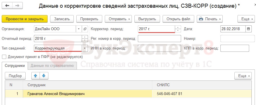В данном случае необходимо сформировать форму СЗВ-КОРР с типом сведений Корректирующая, указав в качестве отчетного периода 2018 г., а корректируемого – 2017 г. В табличную часть формы следует подобрать только работника Гранатова А.А.: