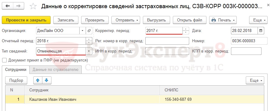 В данном случае необходимо сформировать форму СЗВ-КОРР с типом сведений Отменяющая, указав в качестве отчетного периода 2018 г., а корректируемого – 2017 г. В табличную часть формы следует подобрать только работника Каштанова И.И.: