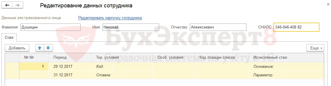 Информация по стажу загрузится на основании сведений, имеющихся в информационной базе.