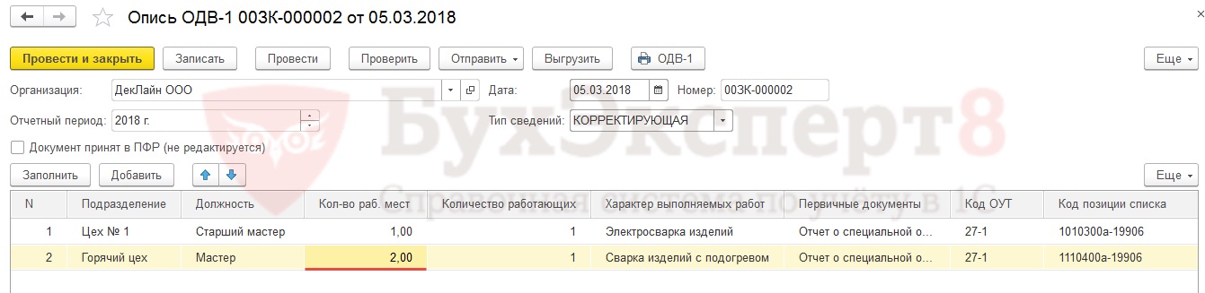 Табличную часть придется заполнить вручную, изменив по сравнению со сданным отчетом только информацию в колонке Кол-во раб. мест с «1» на «2» для позиции Мастер подразделения Горячий цех: