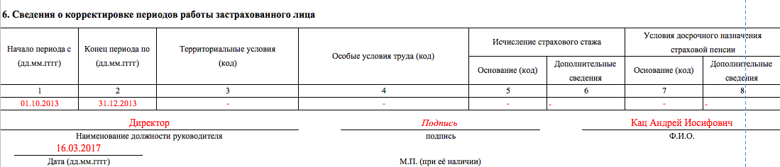 - в графах 1 и 2 – скорректированные даты начала и окончания периода работы застрахованного лица;