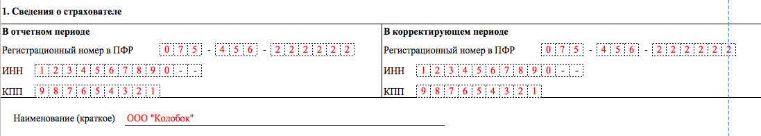 В разделе 1 указываются краткое наименование страхователя, регистрационный номер в ПФР, ИНН, КПП. Данные приводятся в соответствии с п. 2.1 Приложения 5. Заполнить нужно как подраздел «В отчетном периоде», так и подраздел «В корректируемом периоде» (п. 4.2 Приложения 5).