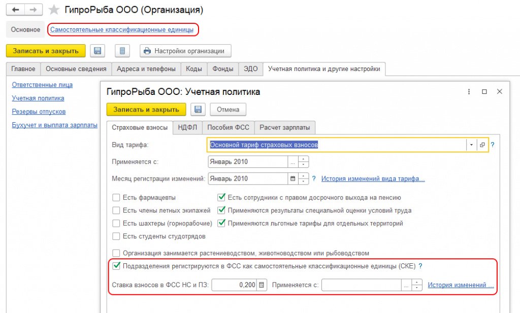 Функциональность, необходимая для регистрации в программе СКЕ и расчета взносов по установленным для СКЕ ставкам, подключается на этой же закладке Страховые взносы флагом Подразделения регистрируются в ФСС как самостоятельные классификационные единицы (СКЕ), см. рис. 2.