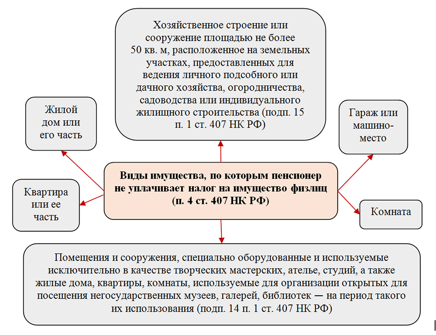 Виды имущества, по которым пенсионер не обязан уплачивать налог на имущество, перечислены в п. 4 ст. 407 НК РФ.