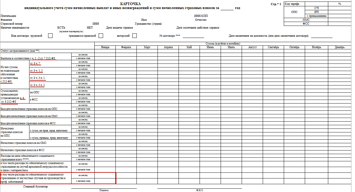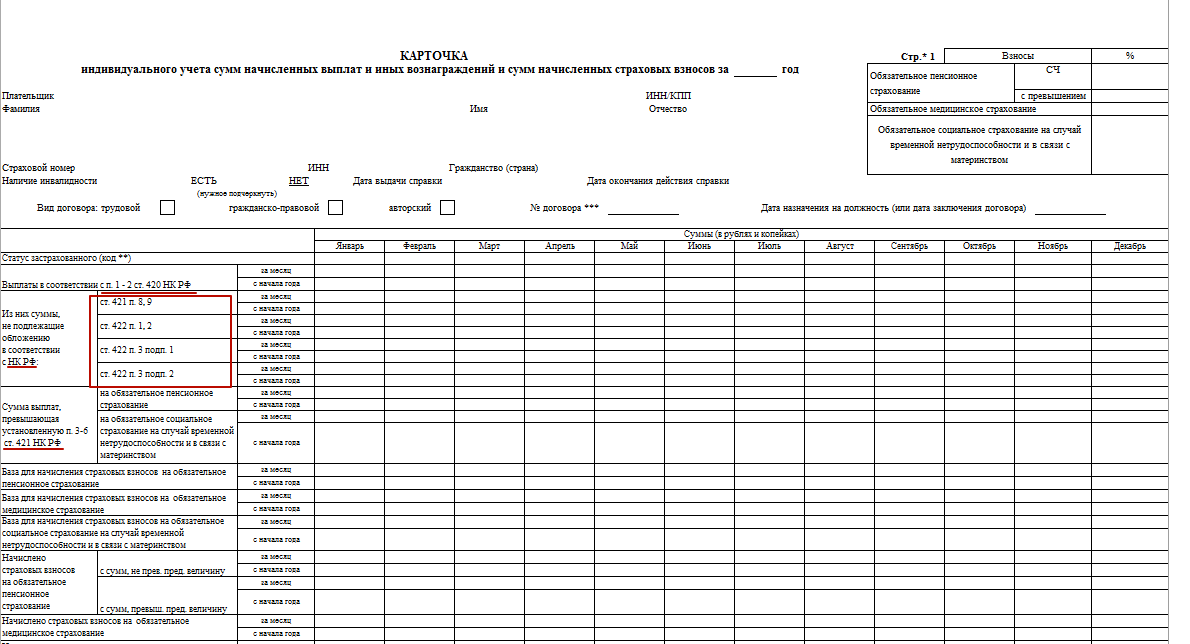По вредным и подобным им производствам, чернобыльцам и др. образец карточки индивидуального учета сумм начисленных выплат и страховых взносов может несколько отличаться, так как нужно иметь в виду дополнительные выплаты и еще ряд параметров (в письме ПФР и ФСС есть такие образцы).
