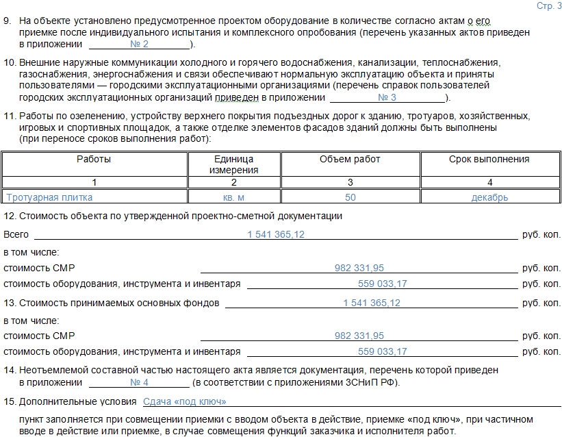 Графа 15. В эту строку вписываются какие-либо дополнительные условия, сопровождающие факт приемки построенного здания/сооружения.