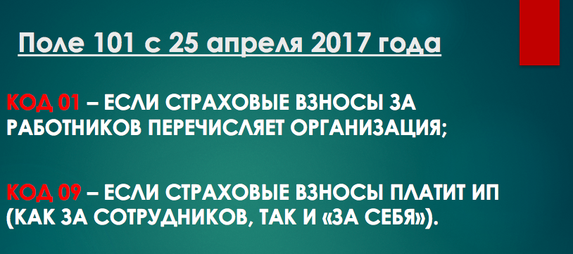 С 25 апреля 2017 года перечень кодов статуса плательщика для поля 101 платежного поручения обновился. С этой даты официально закреплено, что для перечисления страховых взносов по реквизитам ИФНС нужно указывать код: