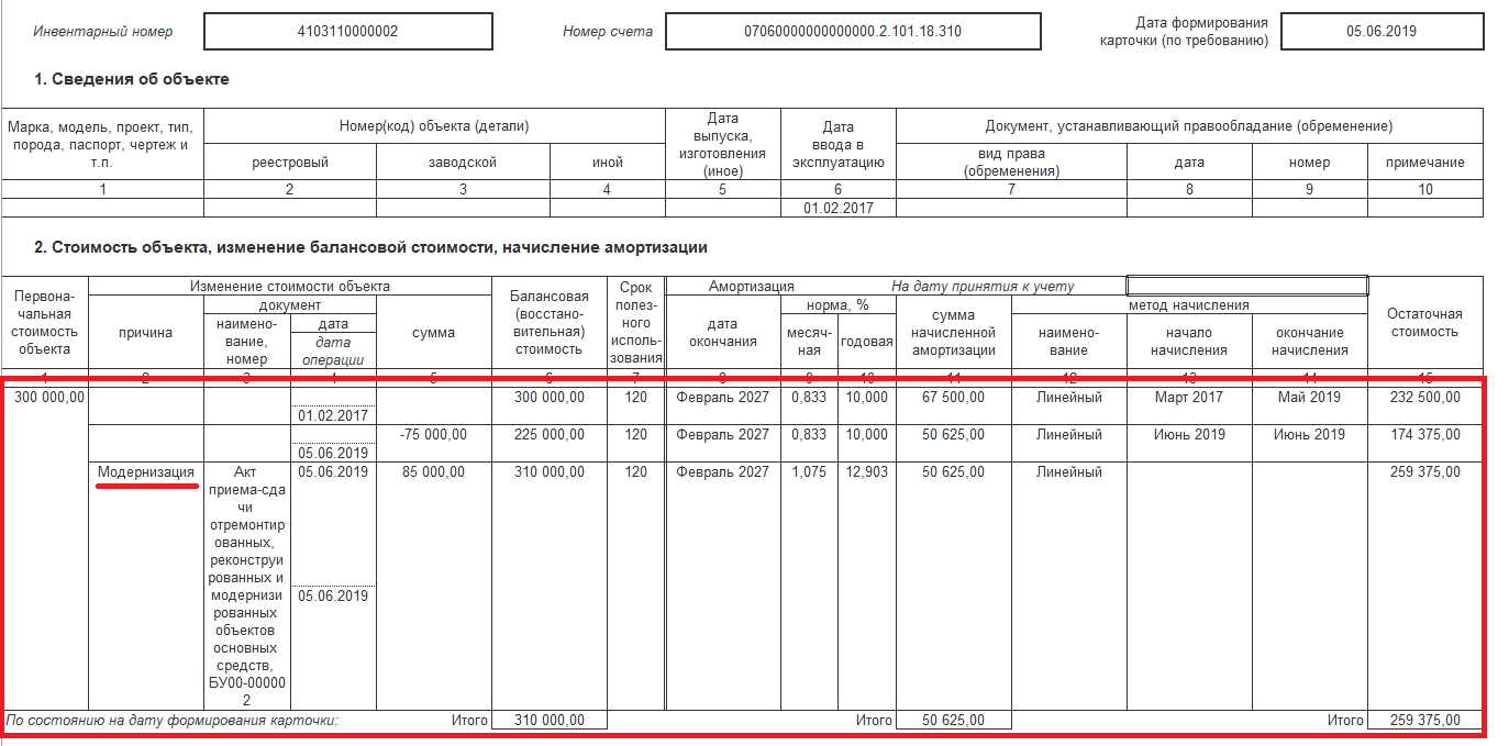 В инвентарной карточке инвентарного объекта сформируются следующие записи: