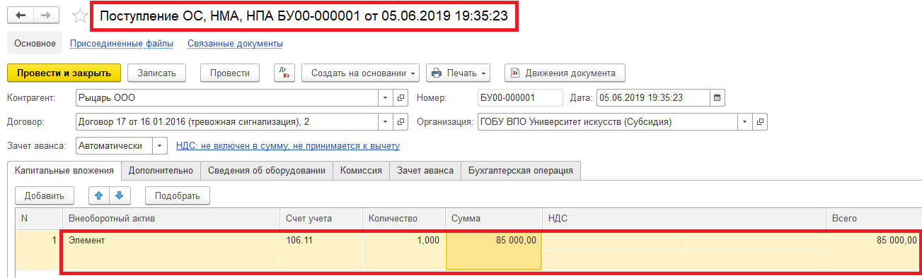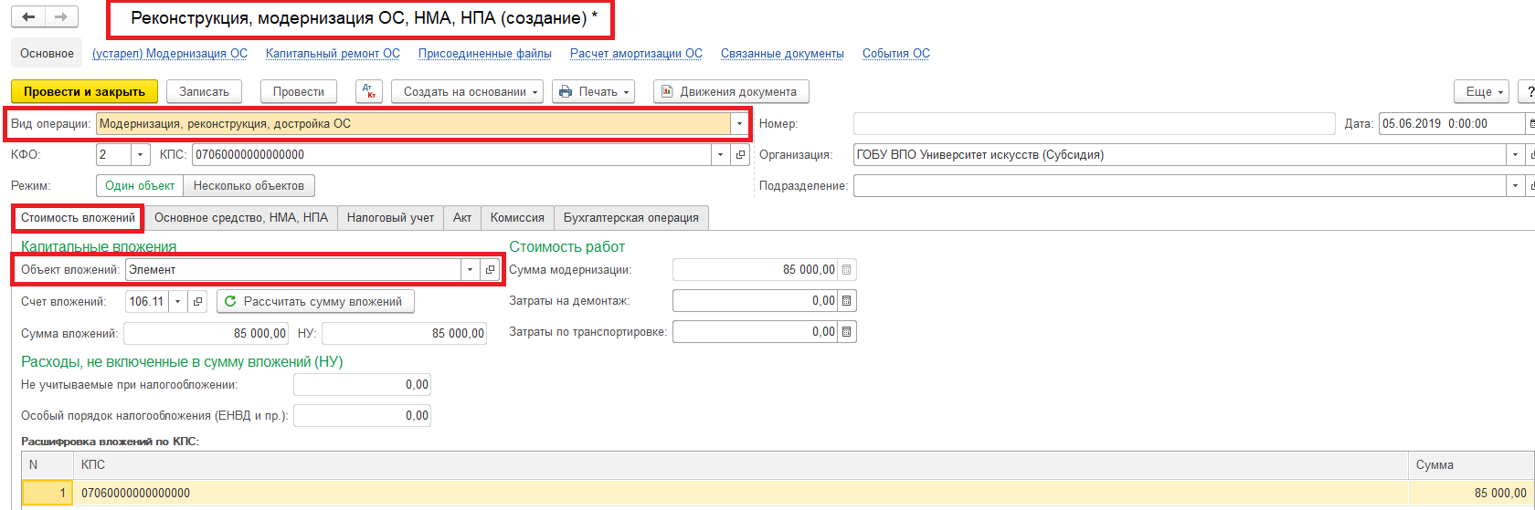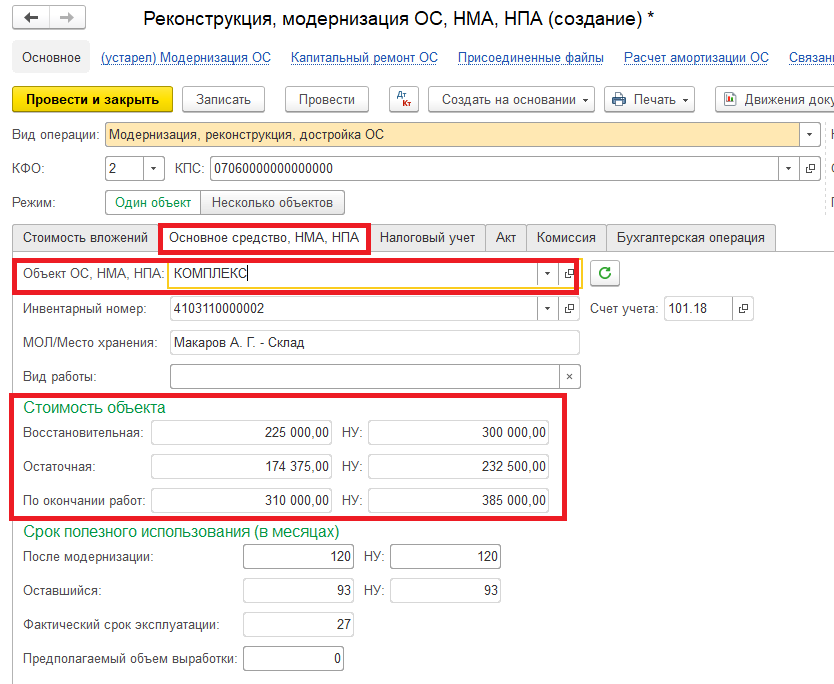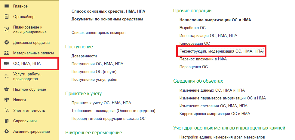 Следующим шагом будет формирование документа, с помощью которого мы покажем увеличение стоимости инвентарного объекта за счет приобретенного элемента. Для отражения указанной операции воспользуемся типовым документом «Реконструкция, модернизация ОС, НМА, НПА» («ОС, НМА, НПА» – «Реконструкция, модернизация ОС, НМА, НПА»).