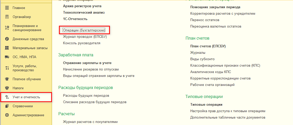 В связи с тем, что в действующей на данный момент редакции программы, отсутствует функционал для корректного списания части инвентарного объекта (без использования разукомплектования инвентарного объекта) для списания объекта, который подлежит выбытию, воспользуемся документом «Операция (бухгалтерская)» («Учет и отчетность» – «Операция (бухгалтерская)»).