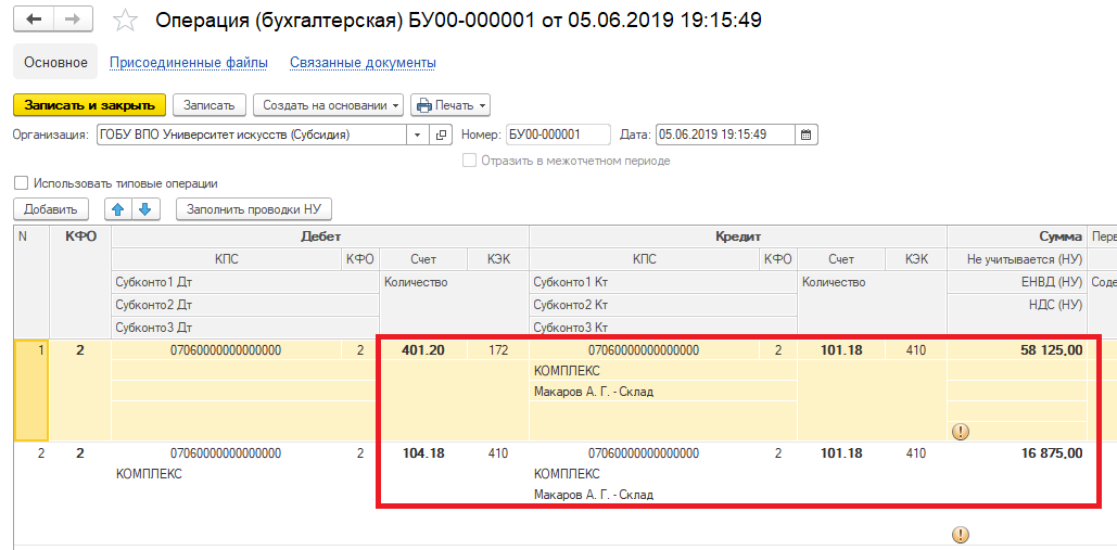 В результате проведения документа программа сформирует следующие бухгалтерские записи: