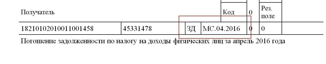 Заполнять поле 107 налоговым агентам требуется и в ситуации, когда погашаются долги по НДФЛ. Если организация погашает долг по своей инициативе (добровольно), то в поле 107 указывайте месяц, за который погашается задолженность. А в поле 106 поставьте код ЗД. Этот код будет означать, что это не текущий платеж, а именно погашение задолженности. Допустим, если погашаете долг по НДФЛ за апрель 2016 года, то платежку составьте так: