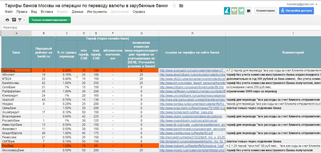 Как видно из таблички, для небольших переводов выгоднее всего использовать банк «Авангард» — комиссия 0,2% минимально 15 EUR и максимально 150 EUR. А вот для валютных переводов крупных сумм нужно использовать «Росбанк» (там комиссия составляет 1,3%, зато верхний предел ограничен 65 EUR).