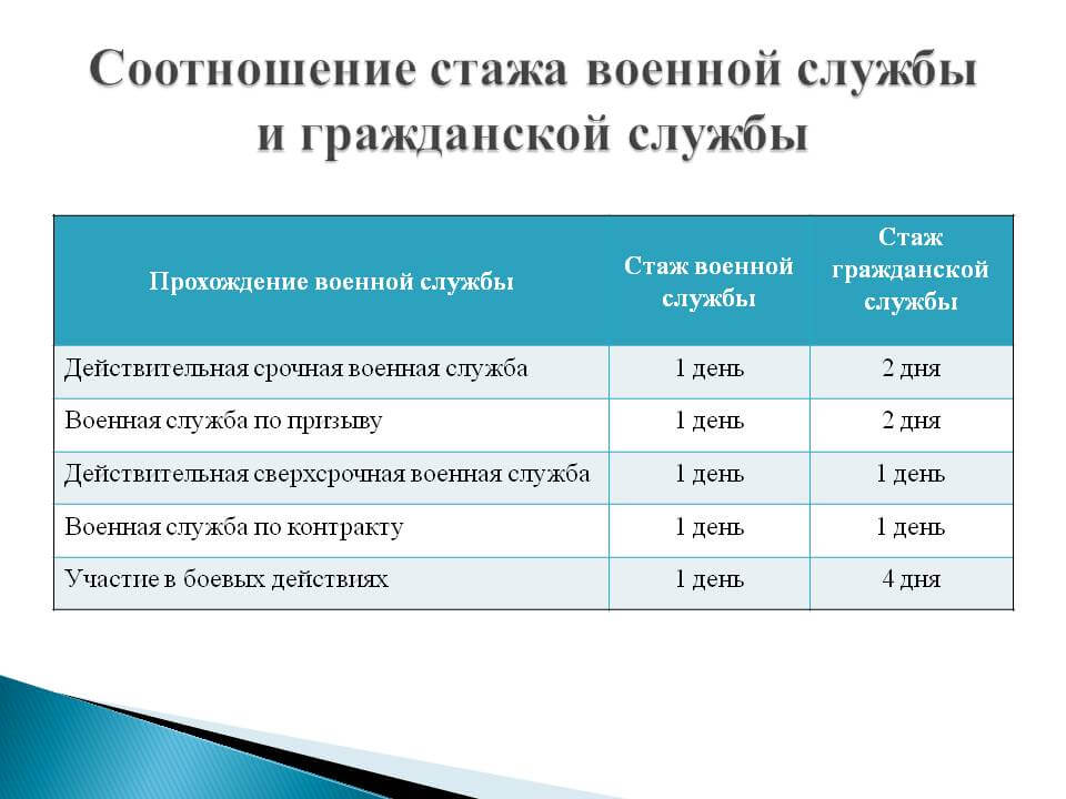 - Если молодой человек служил только на основании срочного призыва, то день службы числится за два дня стажа. Если служба длилась год, то в стаж пойдет 2 года выслуги.