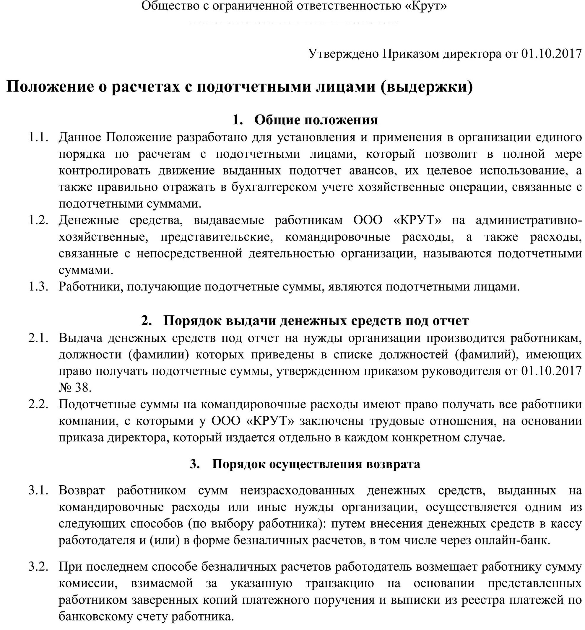 Пример включения в локальный акт положения о способе возврата неиспользованных сумм на расчетный счет организации: