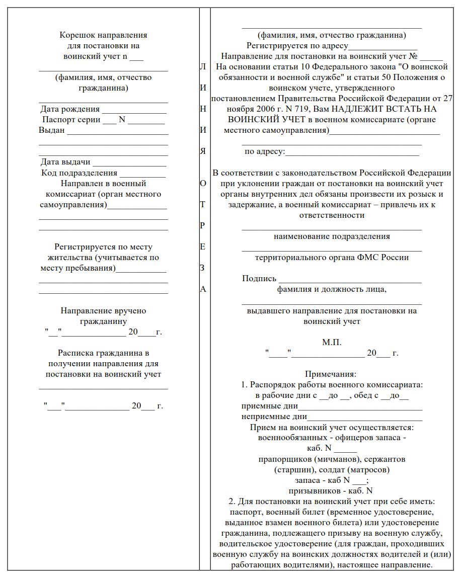 Представители Минобороны РФ в Письме от 01.03.2019 № 315/4/1023 уточнили, что форму направления граждан в военный комиссариат для постановки на воинский учет можно взять из совместного Приказа министра обороны РФ, МВД РФ и ФМС России от 10.09.2007 № 366/789/197 (Приложение № 3). Выглядит эта форма следующим образом: