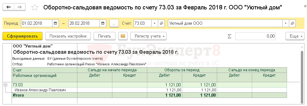 Для проверки взаиморасчетов с сотрудником необходимо сформировать Оборотно-сальдовую ведомость по счету 73.03 «Расчеты по прочим операциям» раздел Отчеты — Стандартные отчеты — Оборотно-сальдовая ведомость по счету.