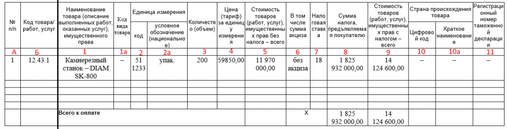 Наименование товаров или описание и единицы измерения выполненных работ, оказанных услуг, переданных имущественных прав. Графа 1а содержит код вида товара по единой ТН ВЭД ЕАЭС, с 1 октября 2017 года ее заполнение обязательно в отношении товаров, экспортированных из России в государства ЕАЭС — в Белоруссию, Казахстан, Армению или Киргизию (в ином случае ставится прочерк). Код товара берется из справочника кодов ТН ВЭД (утв. решением Совета Евразийской экономической комиссии от 16.07.12 № 54).